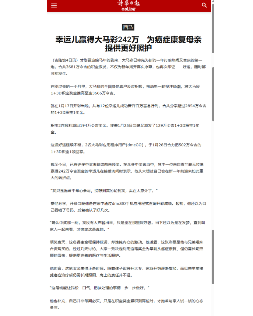 On the day he collected the prize, the winner kept a low profile but could not hide his excitement. He revealed that the winning ticket was jointly purchased with his siblings. After several days of discussion, the family unanimously decided to use the prize money to provide better medical treatment and daily care for their mother, who had previously recovered from cancer but still requires long-term support.