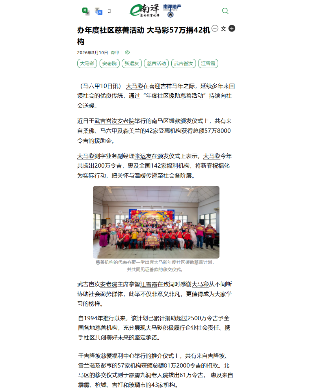 Since its launch in 1994, the program has contributed more than RM25 million to charitable organisations nationwide, demonstrating Da Ma Cai’s strong commitment to corporate social responsibility and its dedication to building a better future together with the community.