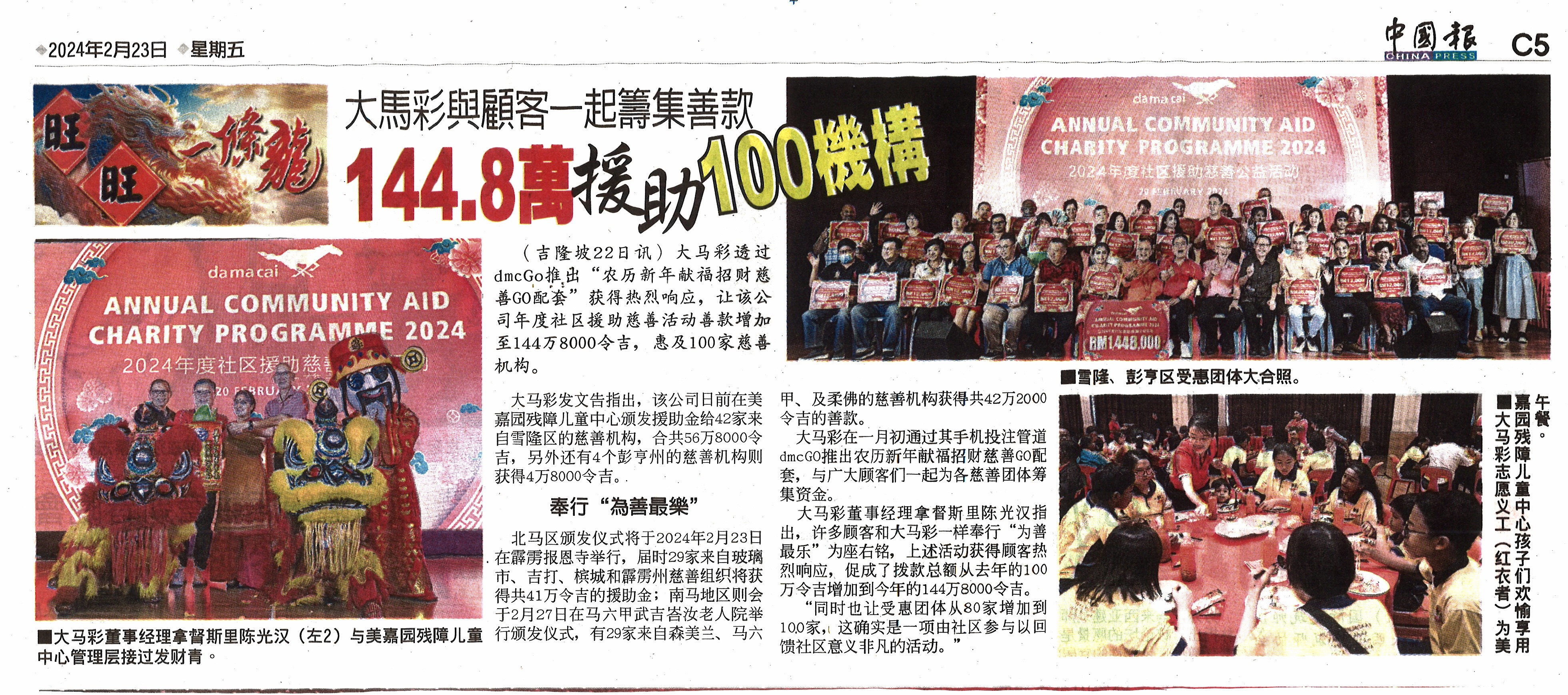 大马彩与顾客一起筹集善款 144.8万援助100机构